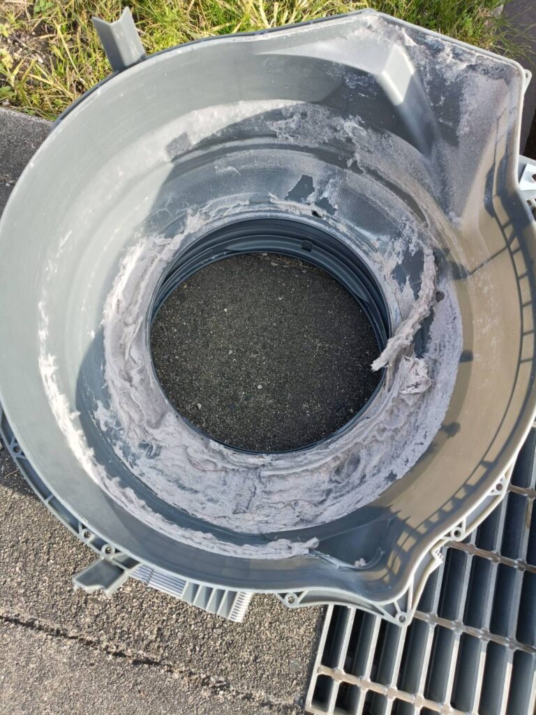乾燥運転中、この空間にも空気が循環するためホコリが付着します。さらに洗濯工程で水に濡れることを繰り返すうち、ホコリはヘドロ状になり、最終的にはカチカチに固着してしまいます。ここまでくると、水流による自動洗浄などでは落とすことができません。